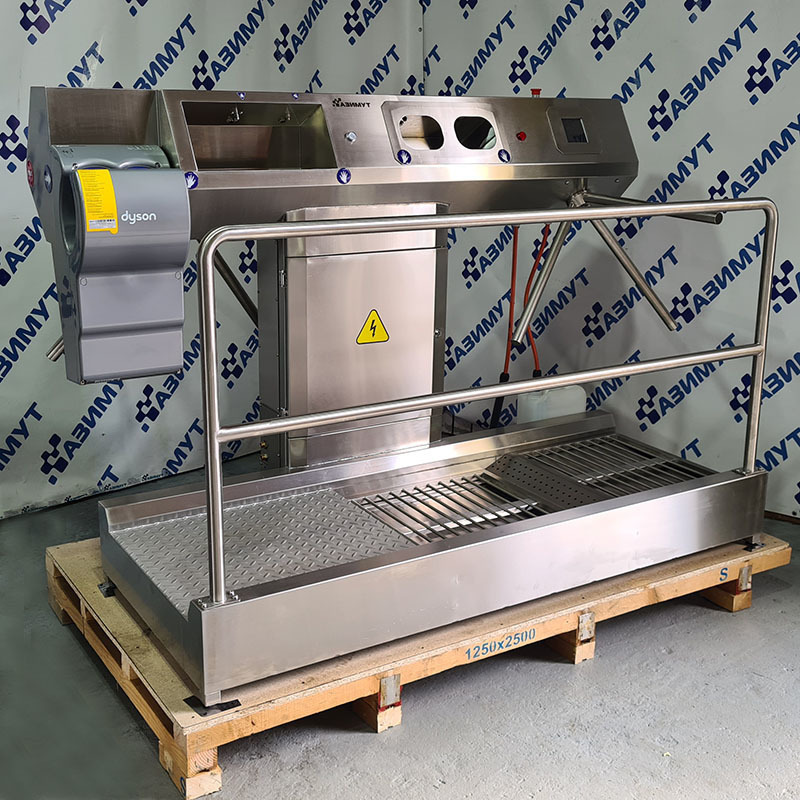 Односторонний модуль гигиены ДМГ-103 DB для дезинфекционной обработки кистей рук и подошв обуви при входе в чистые помещения на производстве и контроле выхода из чистого помещения на производстве.