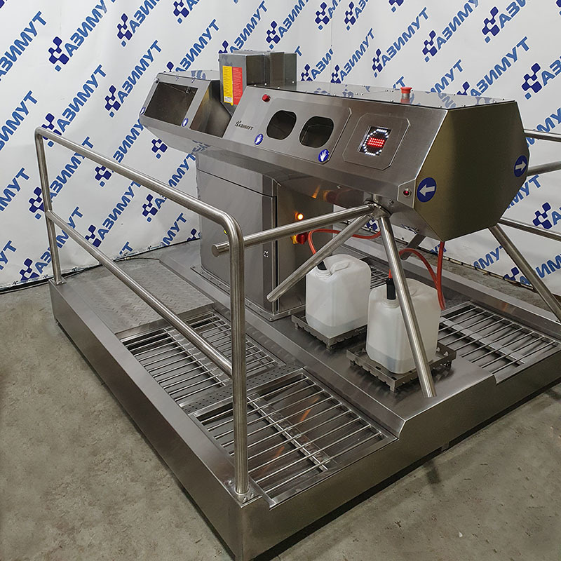 - Система оповещения о критическом уровне дезинфицирующей жидкости с последующей блокировкой турникета. Аналогичные конструкции сразу блокируют проход.