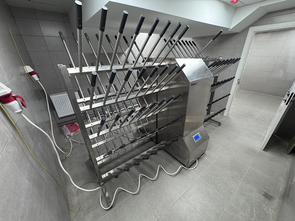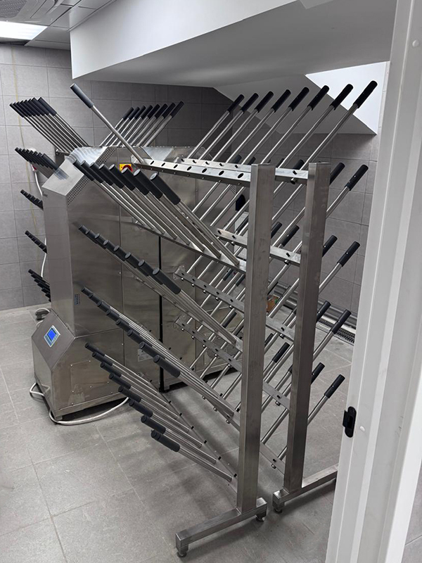 - Точечное распределение нагретого и обеззараженного воздуха в каждую перекладину, на которой расположены трубки-держатели. Поток воздуха равномерно распределяется в коллекторе, и через гибкие воздушные шланги подается в каждую из пяти перекладин. Температурные потери сводятся к минимуму, поток воздуха не теряет интенсивность;