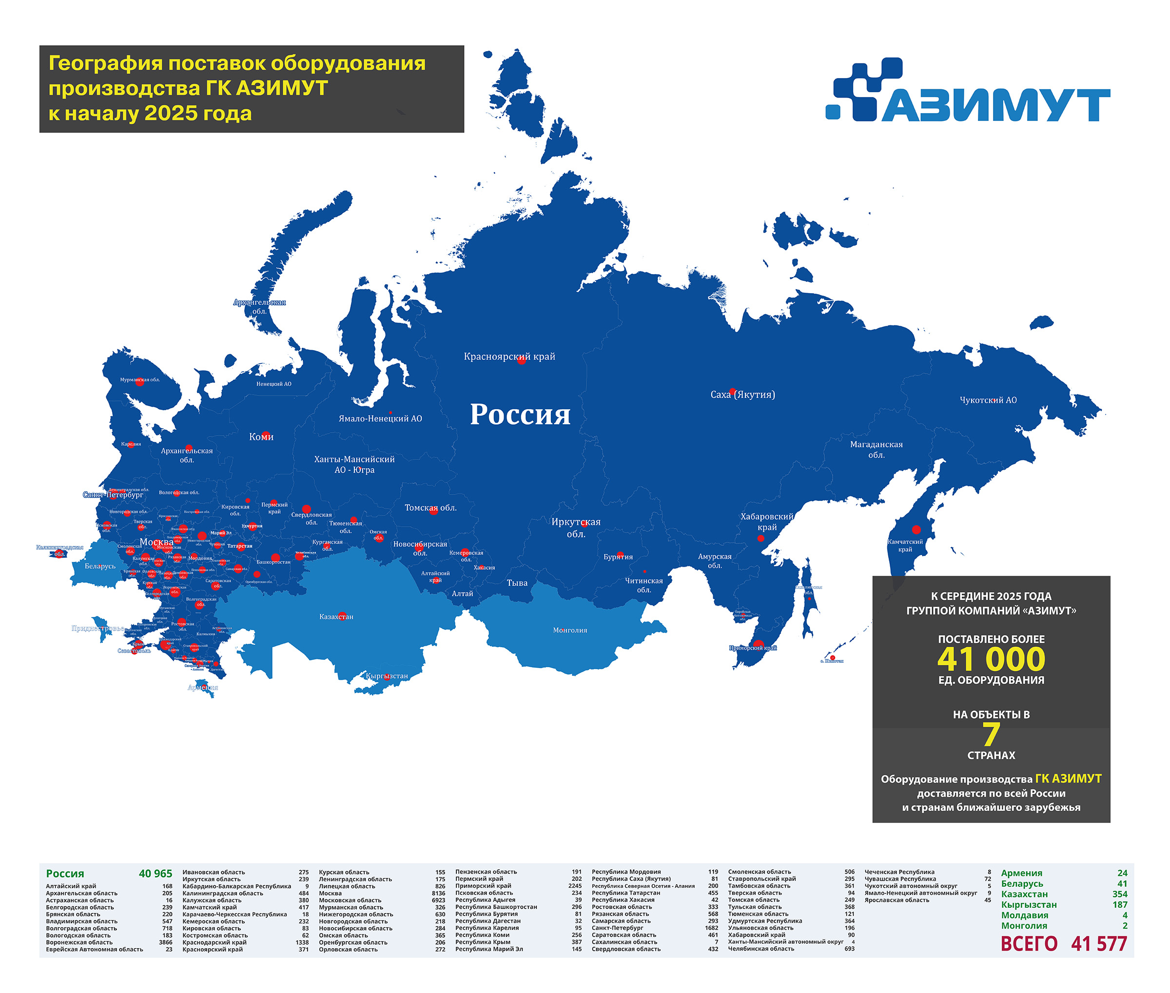 К середине 2023 года Группа Компаний "АЗИМУТ" успешно поставила более 23000 единиц оборудования собственного производства практически во все регионы России и в 6 стран ближайшего зарубежья, таких как Армения, Беларусь, Казахстан, Кыргызстан, Молдавия и Монголия.